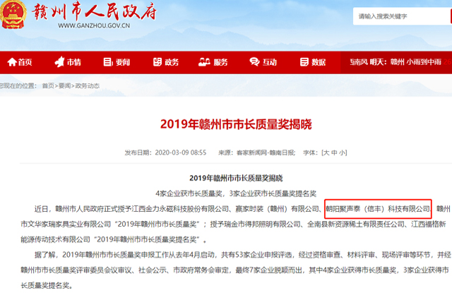 2019年贛州市市長(zhǎng)質(zhì)量獎(jiǎng)申報(bào)工作從去年4月啟動(dòng),共有53家企業(yè)申報(bào)評(píng)選,經(jīng)過(guò)資格審查、材料評(píng)審、現(xiàn)場(chǎng)評(píng)審等環(huán)節(jié),并經(jīng)贛州市市長(zhǎng)質(zhì)量獎(jiǎng)評(píng)審委員會(huì)議審議、社會(huì)公示、市政府常務(wù)會(huì)審定,最終4家公司入圍。朝陽(yáng)聚聲泰(信豐)科技有限公司脫穎而出,被贛州市人民政府正式授予2019年贛州市市長(zhǎng)質(zhì)量獎(jiǎng)。