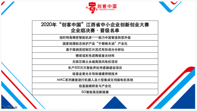 9月9日,2020年“創(chuàng)客中國”江西省中小企業(yè)創(chuàng)新創(chuàng)業(yè)大賽經(jīng)過多輪比拼,終于進入到最精彩的決賽階段!此次總決賽與前面的復(fù)賽都在南昌高新區(qū)舉行,近千名參賽團隊由報名、初賽、復(fù)賽、決賽等各個環(huán)節(jié)組成,經(jīng)過各個環(huán)節(jié)緊張激烈的角逐,終于評出了本次大賽的獲獎團隊,朝陽聚聲泰(信豐)科技有限公司在康良軍同志的代表下,公司“年產(chǎn)500萬只智能聲紋傳感器建設(shè)項目”榮獲了本次總決賽的第三名。